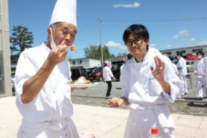 青空の下でお腹いっぱい食べて、1・2年生交流しながら、大満足の表情です。