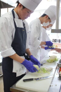 仕込みから食べて片づけるまで1・2年生で一緒に行いながら交流を深めました。