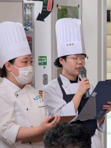 学生料理長の北澤陽香さん(美幌高校出身)はお客様の前でドキドキの料理説明(;’∀’)