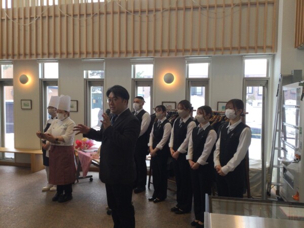 学生料理長の北澤陽香さん(美幌高校出身)はお客様の前でドキドキの料理説明(;’∀’)