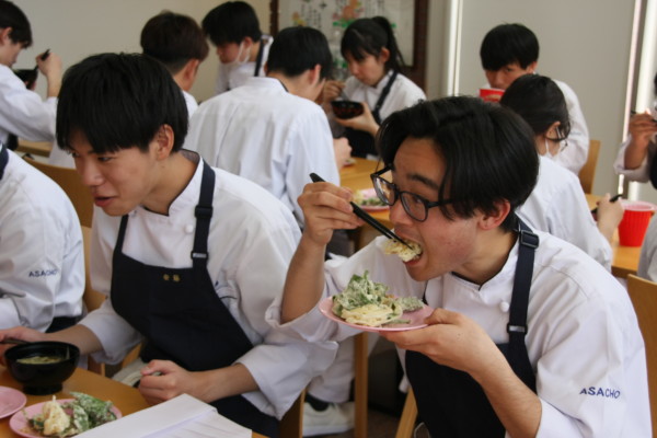 学校に戻ってから、採取したよもぎと独活、本校の畑のアスパラ、じゃが芋の天婦羅