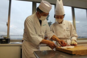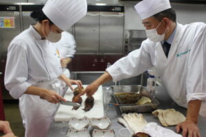 1人ずつ校長先生が丁寧に指導し学生達もTRY🔪